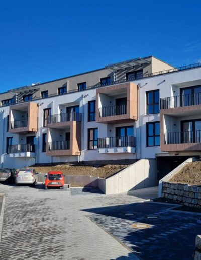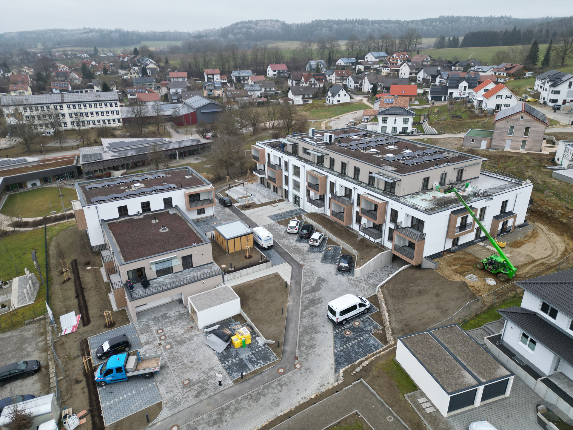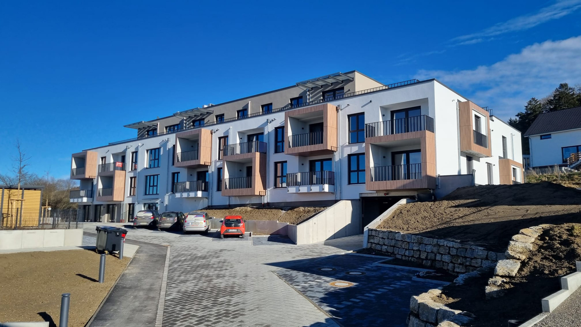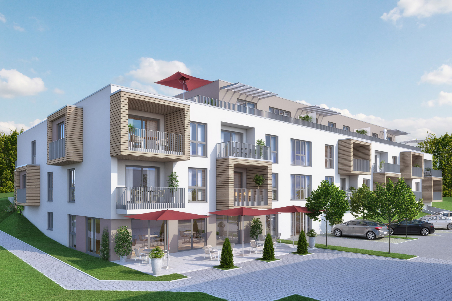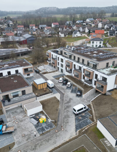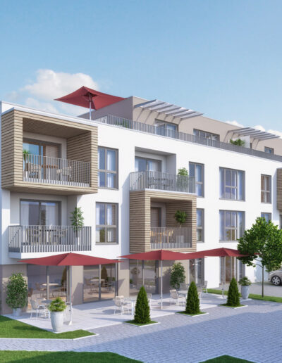 Neubau von 38 Wohnungen in 2 Gebäuden mit Tagespflege. In ländlicher Umgebung westlich von Augsburg sind die Wohnungen auf zwei Baukörper verteilt. Die Anordnung nutzt die Hanglage und ermöglicht so den ungestörten Blick auf den Ort für alle talseitig orientierten Wohneinheiten.