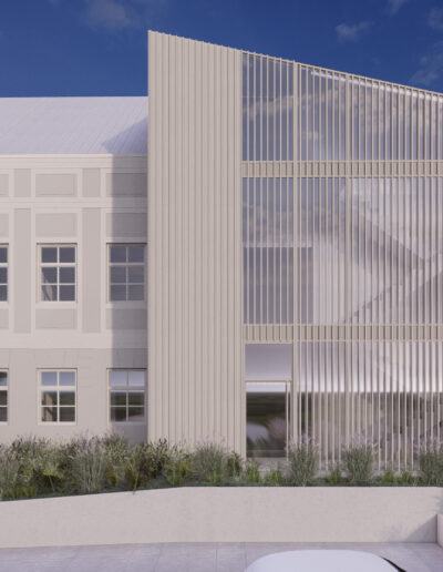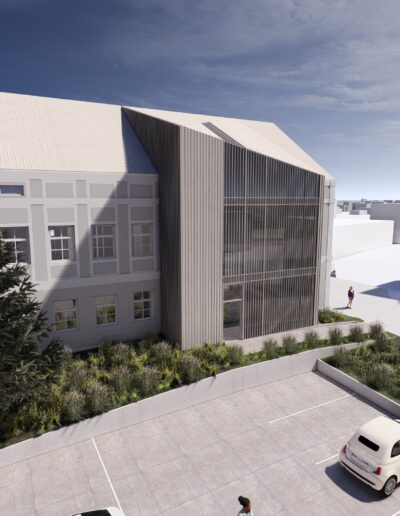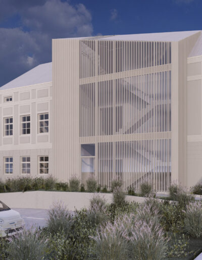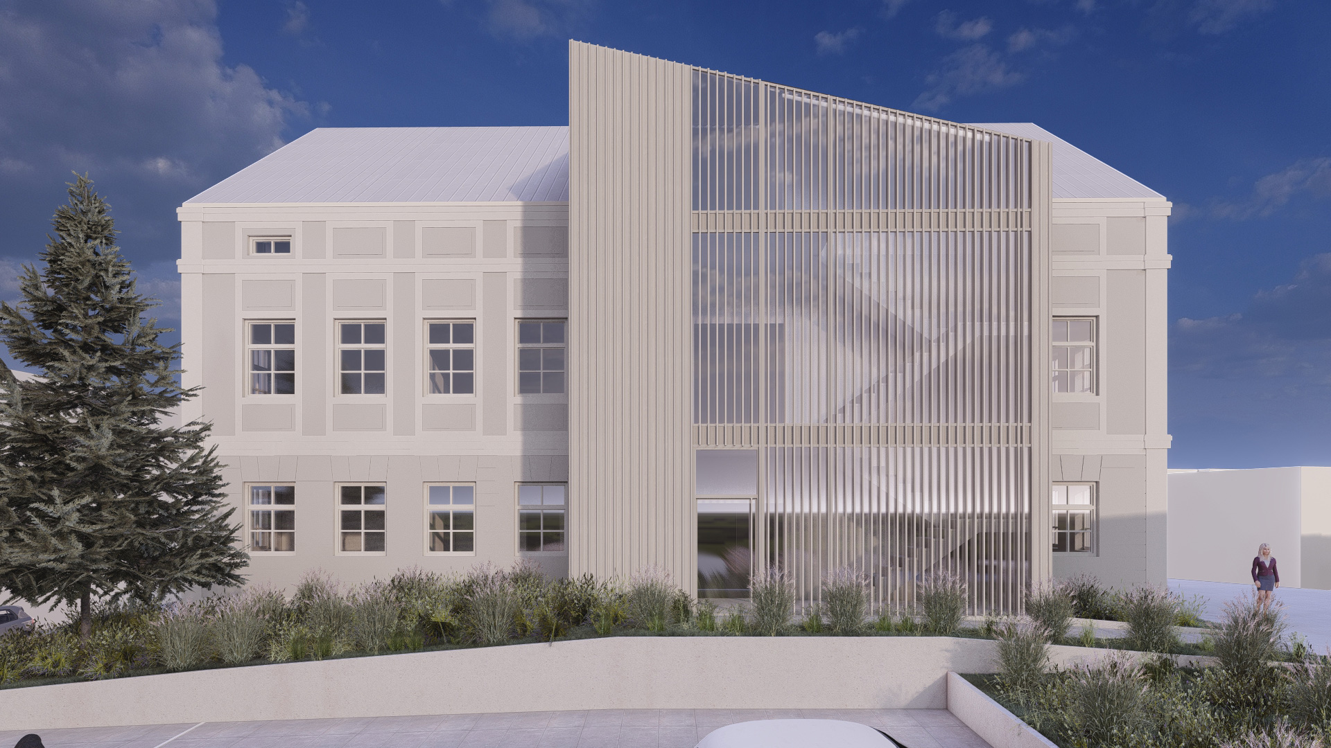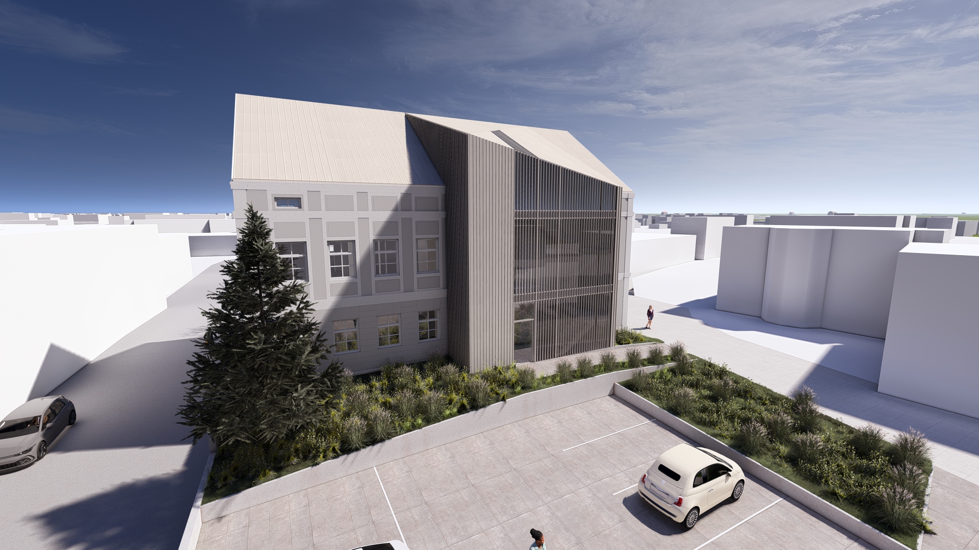 Sanierung und Erweiterung des Gebäudes. Neuordnung Grundrisse mit neuem offenen Büroraumkonzept für 26 Arbeitsplätze und Einrichtung eines offenen Bürgerbüros. Der neue Sitzungs- und Varanstaltungssaal ist im DG verortet. Der Anbau erhält eine nachhaltige Fassade aus Ziegelplatten.
